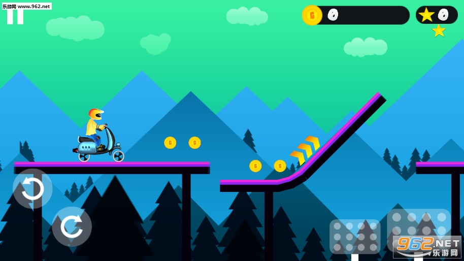 《Scooter Race手机版》是一款画面简约的摩托车题材的特技冒险闯关游戏,游戏中玩家将骑着一辆小轮的电动车在各种高低不平的平台上前行冒险,左下角的两个键是调节重心的,右下角是加速和减速按钮,玩家需要保持好电动车的重心,不要翻车了。