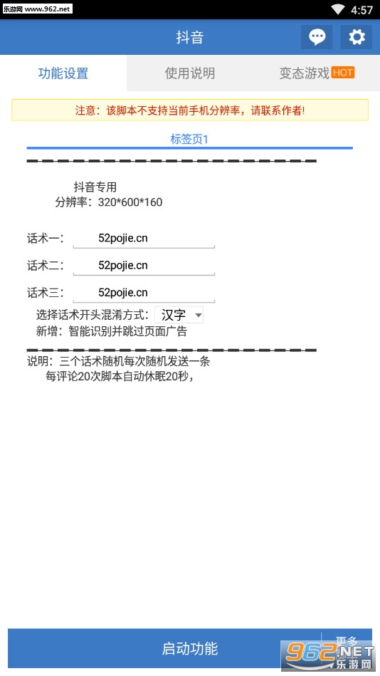 《抖音安卓引流脚本》是一款为喜欢玩抖音的朋友们打造的引流辅助工具,很多刚玩抖音的朋友,没有多少粉丝,观看量也很少,不用担心,本款软件可以自动引流,自动点赞评论,而且使用字母字符和汉字组合,预防被系统检测到。