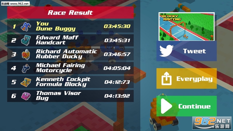 《方块赛车 Blocky Racing》是一款赛车类的竞速游戏,采用了3D的游戏画面,色彩绚丽的游戏场景,丰富的卡丁车选择,在游戏中,你可以利用武器防卫,迎击其他玩家,在游戏的赛道中提供多种的道具使用,当你的卡丁车遭到撞击,方块脱落完就是失败了!