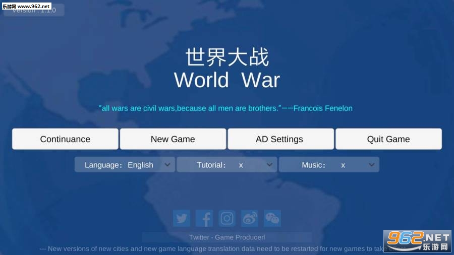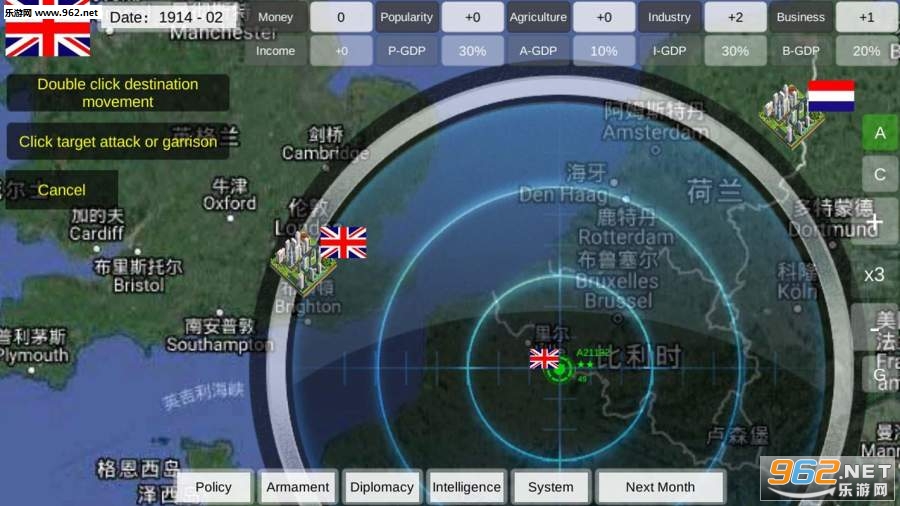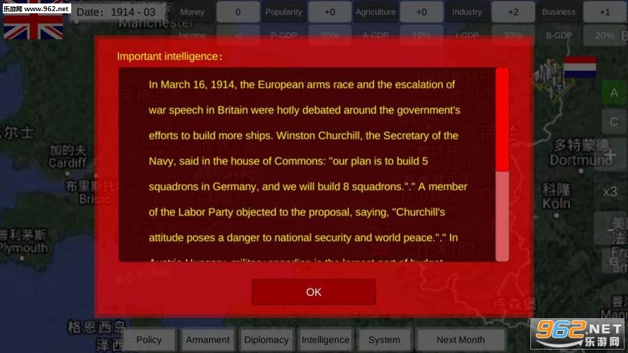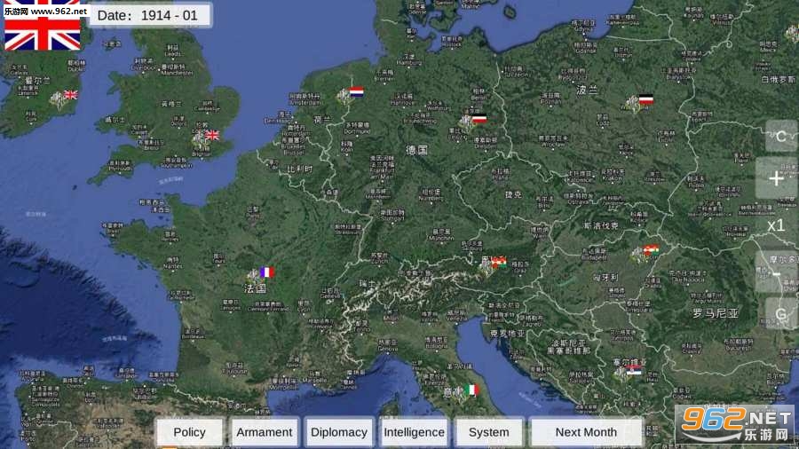 一战给人类带来了深重灾难,但在客观上促进了科学技术的发展。在这个版本里,玩家需通过调整国家政策及城市募兵选择来实现全球统一。在游戏里你可以控制一个国家,通过调整政策来发展经济或是提高财政收入,获得足够金钱后可购买高级军备。当指定募兵城市获取足够兵源后,通过城市军队移动命令你可以制定全球统一策略。