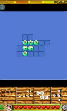 透过寿司方块组合拿分,在多边形的区域,配合切削寿司组合的手法,把寿司大将推送出来的十八种寿司方块填满。