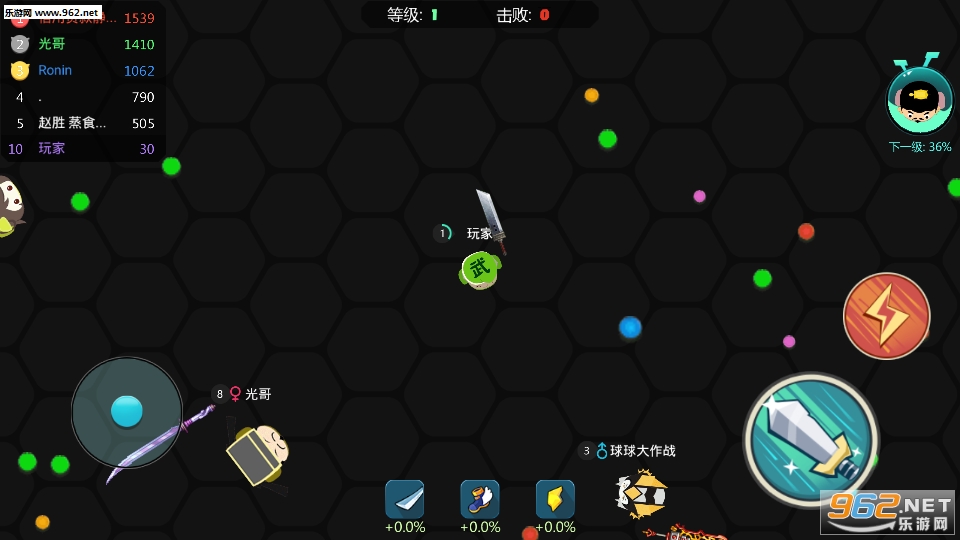 1、吃球:吃球成长,不停的走位,躲避对手的挥刀。