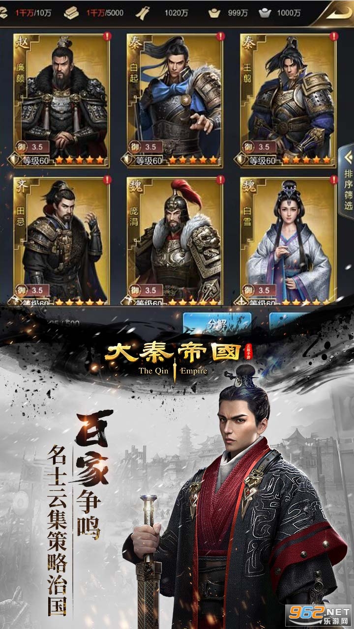 【名将云集】汇聚春秋战国史实武将,囊括海量猛将谋臣英雄美人:杀神白起,战神李牧;刺客荆轲,兵圣孙武;秦后赵姬,宣后芈月……诸子百家,名士云集。