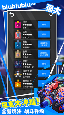 九款超级坦克搭配不同专属技能,助您征战王者之路!升级你的坦克,加强攻击力、增强射速,挑战一切不可能!