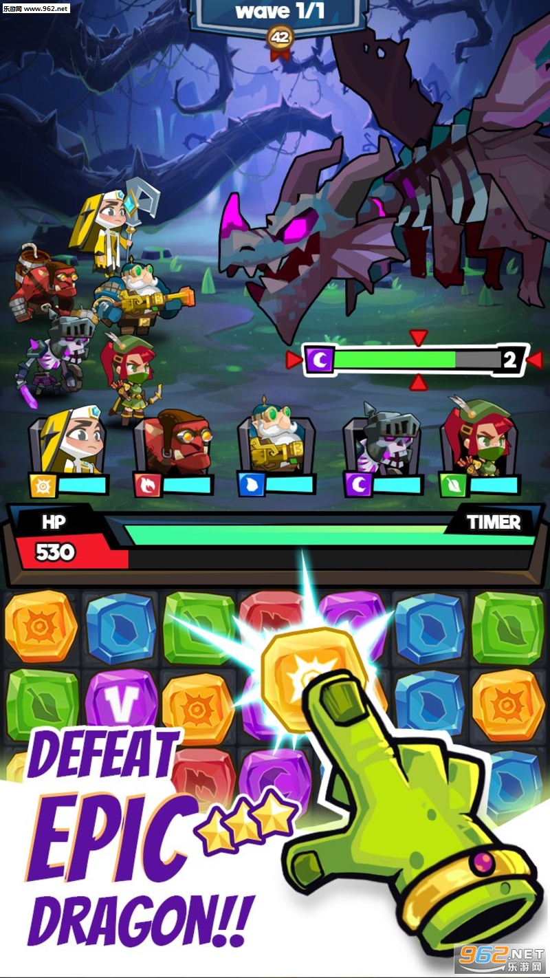 《英雄匹配:传奇谜题RPG安卓版》是一款结合了三消游戏玩法和英雄RPG的混合性游戏,玩家可以装备技能和武器来提升伤害,但是战斗方式却是以三消玩法来发动技能,如果你能够打出足够好的Combo,就算装备差一点也是轻轻松松的。