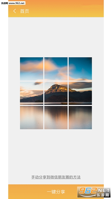 趣味的九宫格相机软件,软件功能比较少,主要就是将图片分成大小相同的九份,可以一键分享到朋友圈、qq空间等地方,喜欢的朋友可以下载试试。