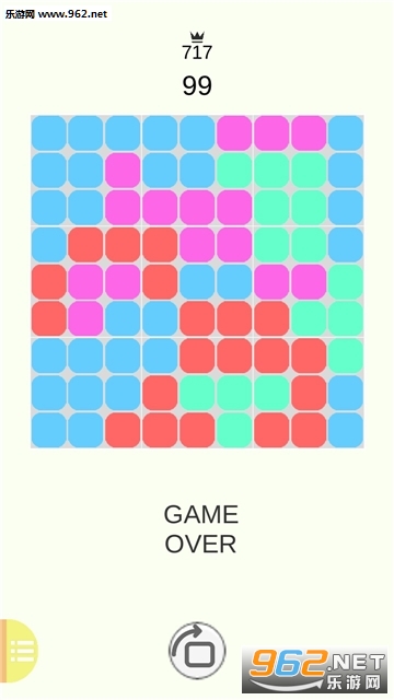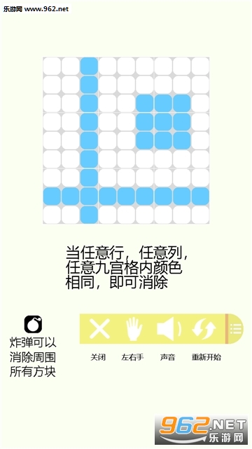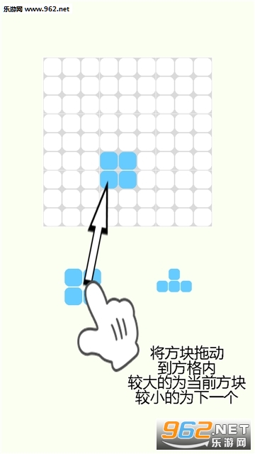 你需要做的就是将方块放入方格中,当任意九宫格,任意行,任意列的方格中颜色相同时,即可将它们消除。当方块无处可放时,游戏结束。