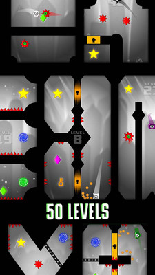 拖动,瞄准和释放以移动角色。注意红色锋利的尖刺和邪恶的老板,因为你的目标是收集丰富多彩的宝石,并通过捕捉星星完成每个级别。