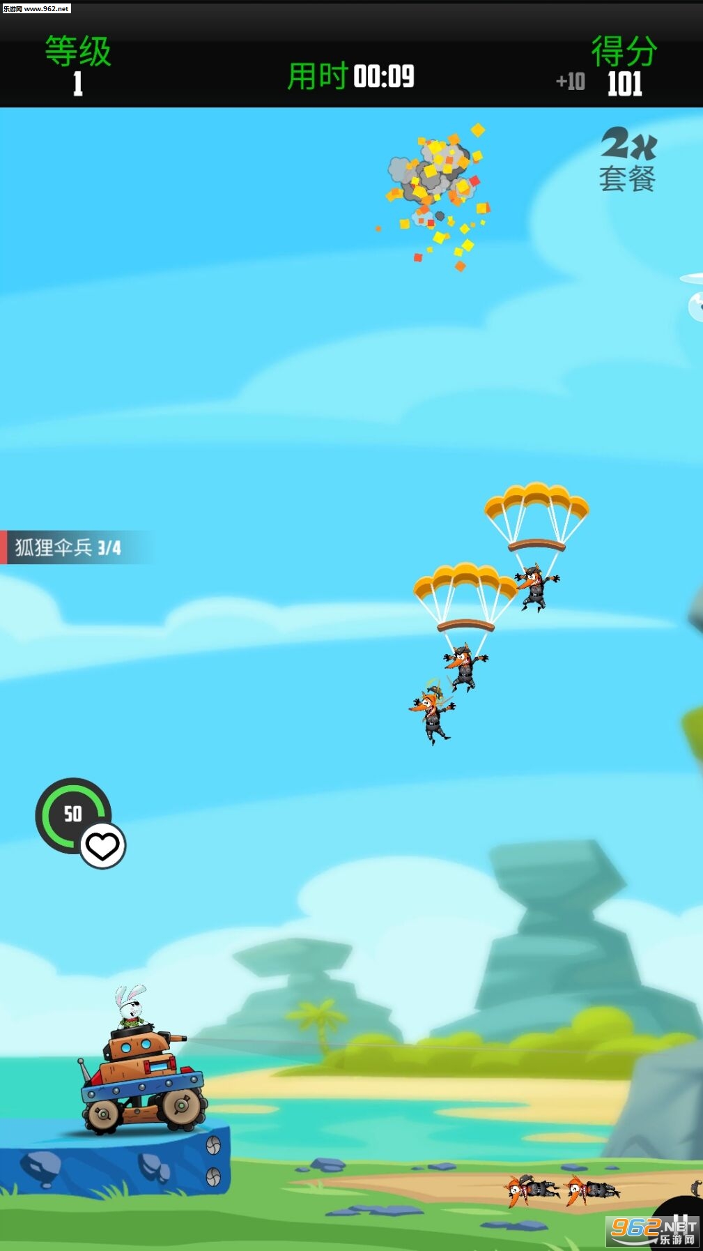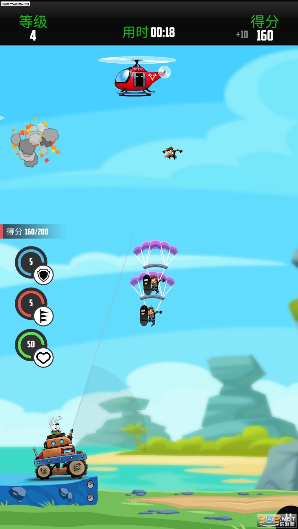 一款高清卡通形式的射击游戏,游戏的玩法以坚守阵地的形式发动;而敌人全部来自空中降临的狐狸伞兵,而你只需要控制好兔子驾驶的坦克战车;将所有伞兵击杀掉就可以获得胜利,游戏可以进行各种成就任务挑战,完成就可获得一定就爱你,用这些激昂历来升级的坦克战车或者购买辅助道具。你要存活下去,才能见识更多的不同。