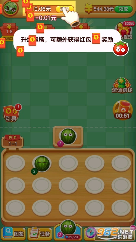愤怒的西瓜是一款玩法非常有趣合成玩法游戏,比较简单易于上手操作,点击操作合成不同等级的水果,玩家可以将两个同等级的不断合成新的水果,之后再进行放置会更加容易一点,通关数量累积达到一定的数量以后,可以获得一定的分红奖励的。