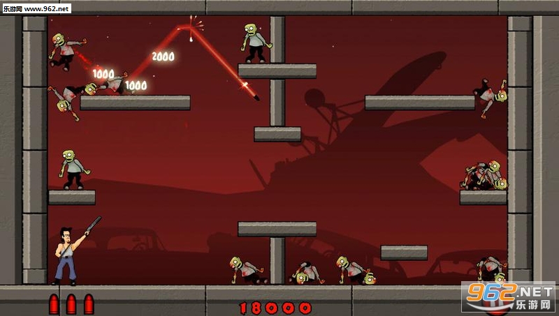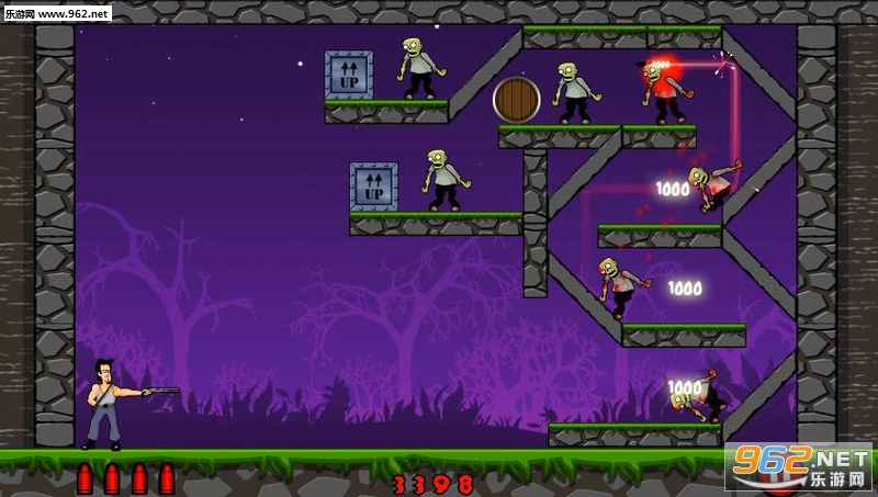 由于僵尸数目大于你的子弹数,并且有些僵尸站的位置你用枪根本射不到它。所以玩家需要利用子弹的反弹来消灭大部分的僵尸。游戏一共有300个关卡,绝对足够你打发时光。现在就拿起你手中的枪,将这些愚蠢的僵尸都打发回老家吧!