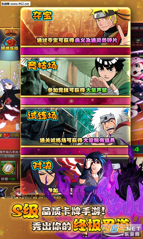 1、根据火影忍者改编的一款卡牌竞技手游,真实的忍者世界等你来体验,超强的忍术由你来操控;