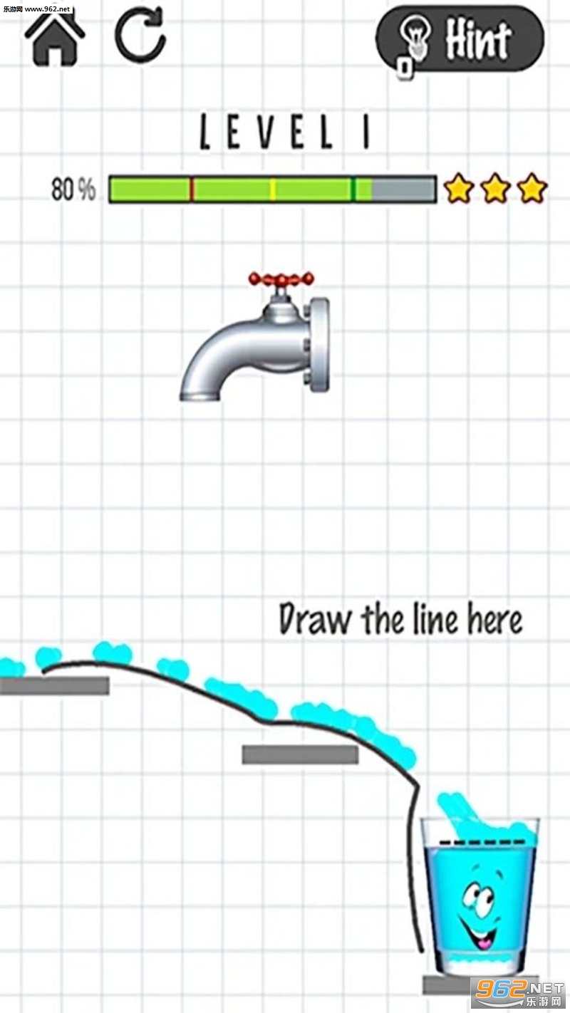 水杯很难过,因为它是空的,它需要水。你的任务是从水龙头到玻璃画一条线,用水填满玻璃,让它快乐,再次微笑!