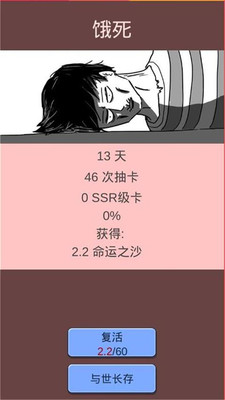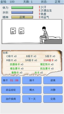 《魔卡求生最新版》是一款卡牌策略类手机游戏,同时也是一款生存游戏,其游戏玩法有点类似屌丝买房记.抽卡的同时你还要关注自己任务的各项属性状况.是否生病,口渴,饥饿等等.然而一切突发状况的发生,都需要你提前就能预测好.又是后运气太差也是很难生存的哦!感兴趣的玩家快点下载魔卡求生开始生存游戏吧!