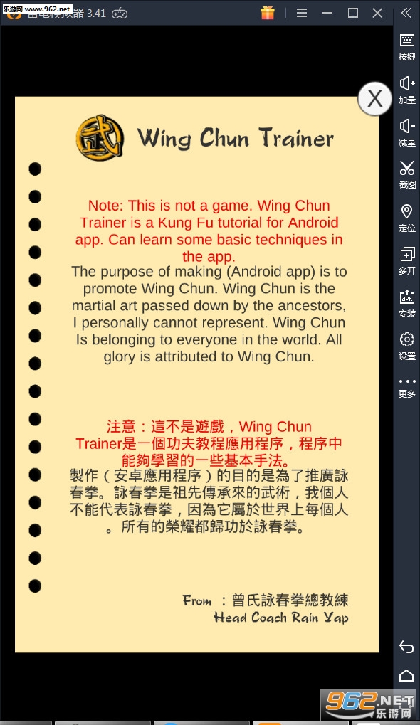 如果你喜欢功夫电影,如果你喜欢咏春拳,如果你想学点格斗技巧,那么这款游戏刚好满足你的这些要求,咏春拳教练都要用的咏春游戏,光看不行还是得练,想成为咏春达人就赶紧下载吧!