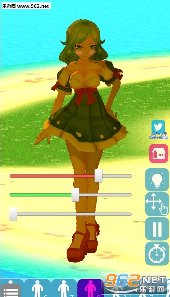 2、3D场景,默认包括海滩和家两种场景,服装造型主要有三套,当然玩家可以召唤出更多的场景和服装;