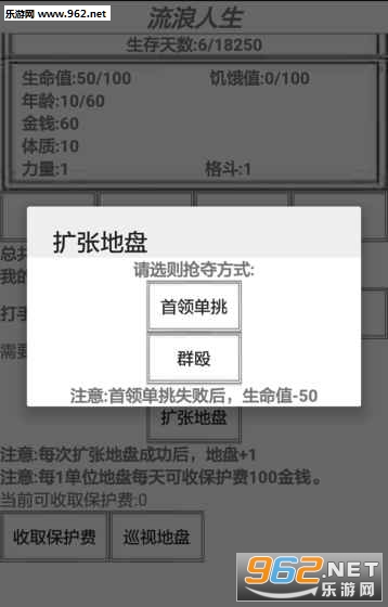 分别进行力量、体能、格斗训练,这些技能指数能帮你在抢地盘的时候出一份力,等你有了一定的实力之后,会有人跟你发起挑战,可以选择单挑或者群殴,单挑的对象是对方的首领,建议选择单挑首领,打败对方之后,收益更大。