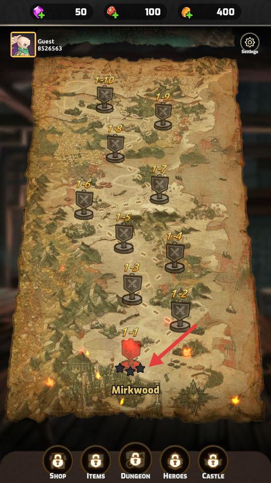 4、由于条件限制,初始只开放战斗系统,在战斗功能的选项栏里,玩家可以看到关卡总数和奖赏的战利品,解锁这些刺激的关卡,就能开启更多的挑战内容,升级英雄,不断的闯关。