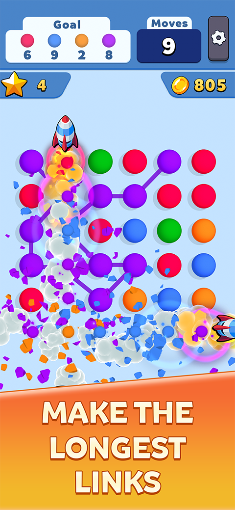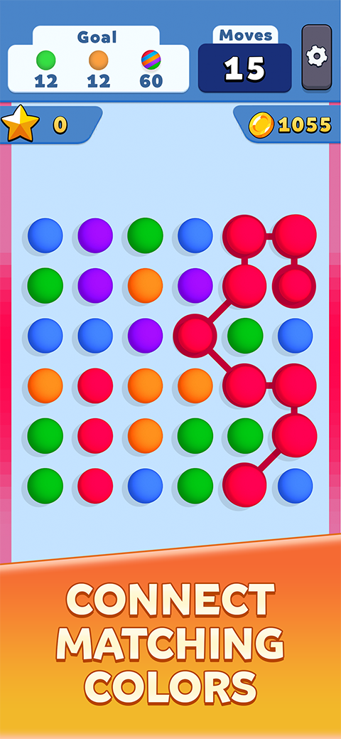 开心连球球游戏是一款休闲消除小游戏。玩法非常的简单,只需将相同颜色的球球连接起来即可消除,并且连接的线越长消除所得的分就越高,完成任务目标即可通关,通关后会自动解锁下一关卡,随着越是到后面的关卡难度也是逐渐的提升,但是不用慌,关卡里提供了各种丰富的道具,有炸弹、火箭、洗牌等,有了这些可以助你轻松通关。