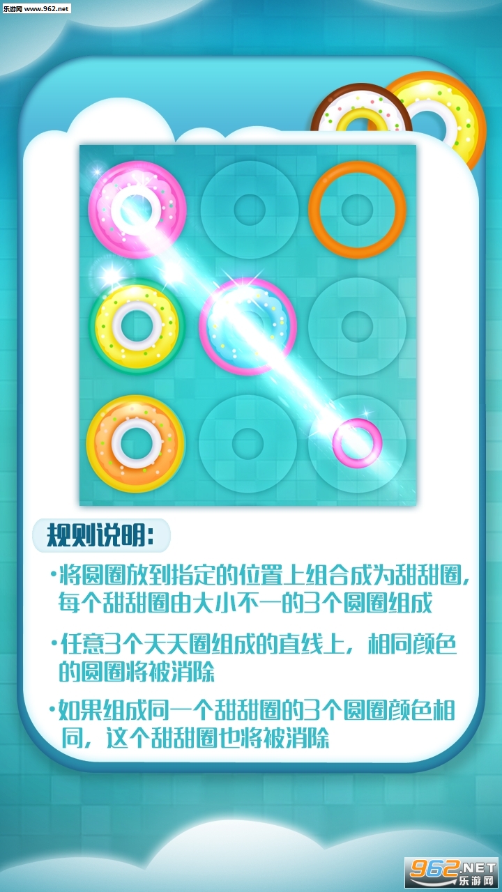 如果组成同一个甜甜圈的三个圆圈颜色相同,那么这个甜甜圈也将被消除!