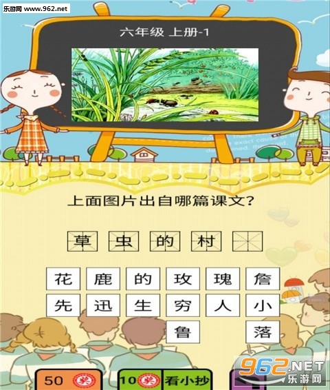用户只需要识别出图片内容所传达的信息,然后从应用提供的文字中选择正确的文字填入即可,应用的涉及面相当的广,其中包括六年级语文课文、儿时动画片、电视剧等等,六年级疯狂猜图,快来挑战吧