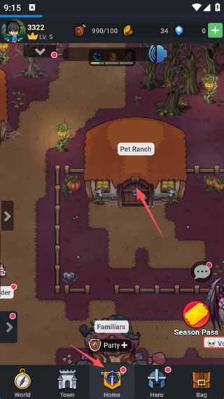 5、出副本后,点击屏幕下方的“Hone”,再将屏幕右移,找到“Pet Ranch”,点击即可。