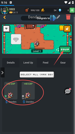 7、宠物可以通过打怪升级,也可以点击屏幕右侧偏上的“EQUIP”装备宠物。