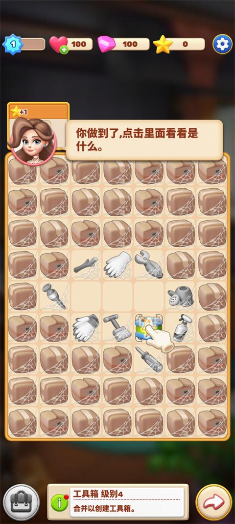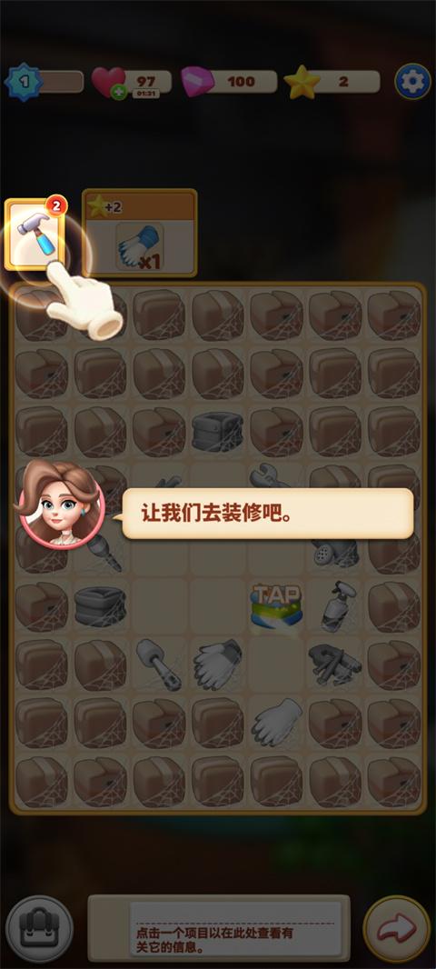将拼图游戏板上的两个相同元素合并,创造新的物品和工具,以翻新客厅、卧室、厨房、花园和温室等各种房间;