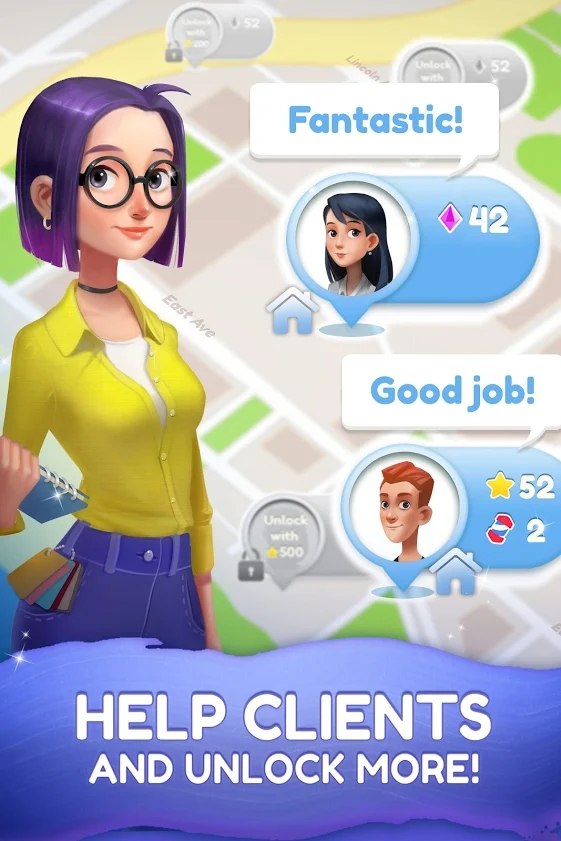 1、解决匹配3个拼图级别并解锁数百个新装饰项目,以帮助您的客户创建他们的梦想家园,最终的设计完全取决于您;