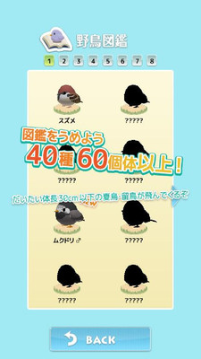 充满想象力的游戏世界,享受不一样的关卡历险,幻想的世界中和鸟儿度过愉快的每一天,40多种不同的图鉴玩家需要全部收集哦,小鸟的各种模样统统保存起来吧,在绿树成荫的环境中感受美好的大自然。在游戏中,玩家需要在野外观察小鸟,并收集各种类小鸟的信息。用合适的食料来引诱小鸟,但不是让你捉小鸟回去哦。只要收集它们的图签就可以啦 ,游戏共有40个种类以上的小鸟等着你去收集。