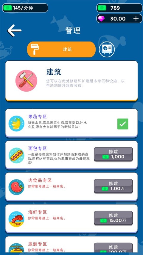当然只有一个果蔬专区肯定是远远不够的,后面大家可以去扩建其他的专区,面包、肉食品、海鲜等等。
