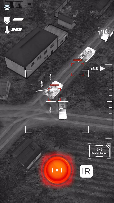 4、点击屏幕下方的“红色投弹”就可以投放炸弹,步兵可以通过防空导弹进行防空,并且有跟踪效果,轰炸过程中,最后时刻移动,不建议悬停轰炸。
