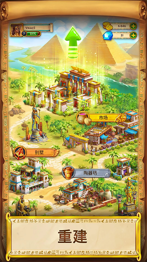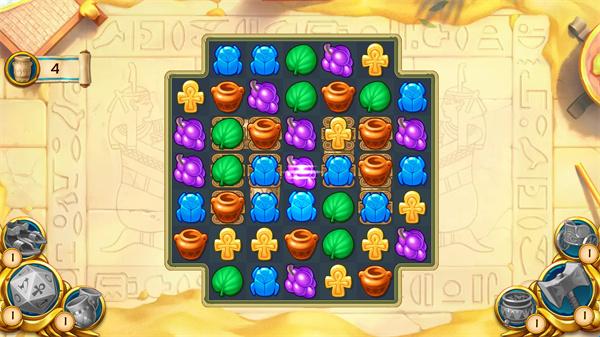 游戏将玩家带回到没落的古代埃及,这里饱经破坏,亟待复兴。玩家要通过解开大量三消谜题来交换与匹配宝石,每完成一次成功的匹配消除,就能获得一定数量的资源。这些资源是复兴文明的关键,从修复建筑所需的砖石,到装饰用的珍贵饰品,都依靠玩家在消除过程中收集。
