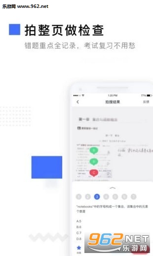 使用“拍整页”模式,将整页作业置入相机拍摄范围内,即可一键检查作业。选择题自动批改,其他的可通过搜到的题逐个核查,手动标记对错。通过即时的作业反馈,快速地定位知识上的缺漏,作业、学习都将更有针对性,更高效。