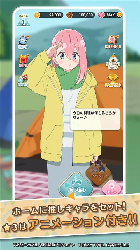 摇曳露营手游(ぱずキャン△)是根据动画《Yuru Camp△》改编而来的一款休闲消除游戏,通过三消的形式简单的操作,搭配5种棋子,给玩家带来无穷的乐趣。在摇曳露营手游还能够逐渐收集各务原抚子、岛凛、时野绫乃、大垣千秋、犬山葵、斋藤惠奈等自己喜欢的卡片和多样的趣味物品,与“Yuru Camp△”的成员们一起享受消除游戏的无限欢乐,带给您放松的游戏体验。