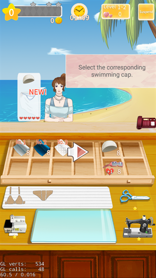 3、你需要完成顾客不同的需求,用最快的时间将泳衣制作出来,完成顾客的需求就可以获得金币奖励。