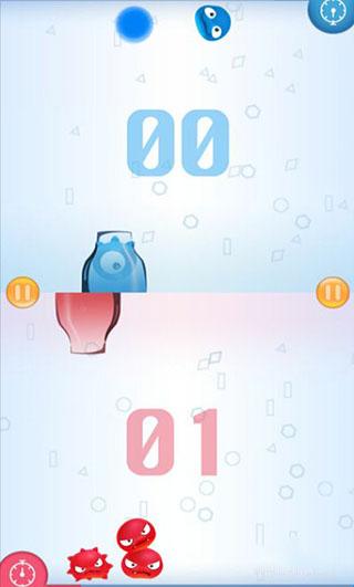 6、红蓝双瓶会不断随着中线飘移,而且瓶口会落下蓝怪或红怪,当恰好与最底下的小怪重合时,本方就加1,一圈时限谁重叠越多谁即胜。