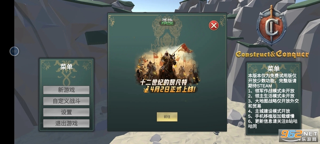 《12世纪的黎凡特》是一款颇具创新精神与历史底蕴的免费策略经营游戏,游戏融合经营、策略、竞技元素,由5名成员历时3个月完成原型设计,取材于十字军东征时期的阿拉伯世界,讲述落魄青年领主在沙漠带领子民重建家园、抗击敌军、重夺霸主之位的故事,考验玩家的战略思维与战术反应,从城市建设、经济发展到军事防御、对外扩张,都需全身心投入,适合喜欢策略经营与历史题材的玩家尝试。
