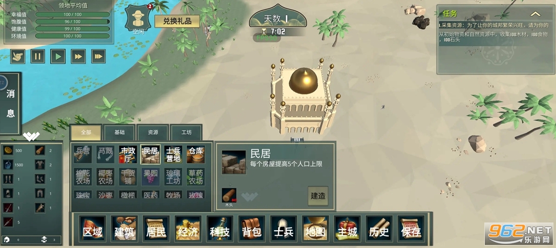 在这里,你可以带领农民耕种土地、开采矿物、采伐树木,把一个沙漠小镇从只有一座城的中心建设成繁荣的沙漠绿都。