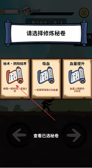 2、完成升级后进入秘卷选择界面,按照界面提示选择修炼秘卷,选定像秘术·阴阳结界这类秘卷,即可获得对应的战斗增益效果。