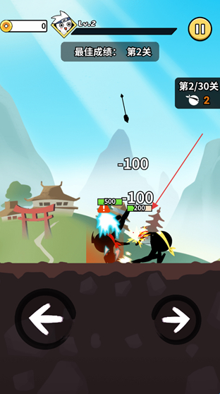 3、进入第2/30关的战斗场景,操作方向按钮击退敌人,同时留意敌方攻击造成的血量扣除情况。
