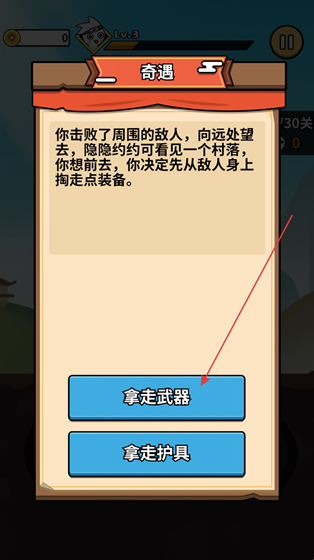 4、战胜敌人后会触发奇遇事件,此时可在界面里选择拾取武器或是护具,通过获取这些装备来提升自身的战斗能力。