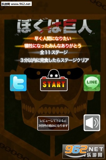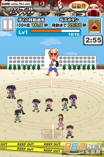 游戏要训练进击巨人成为很会吃的巨人,而且巨人还会依照场景而有不同穿着,例如校园场景,巨人就会换上制服来到学校,玩家需要在时间内让巨人追逐学生,并将学生全数吃光,可以让巨人进化然后越跑越快。巨人在第一关奔跑速度相当慢,不过晋级后,巨人会进化,移动速度会稍微快些。关卡的难易度以星号区分,星号越多越难,由于巨人需要一关关来进化,所以依序来游戏比较容易过关。这些关卡有在学校、住宅区、商店街….等等地方。