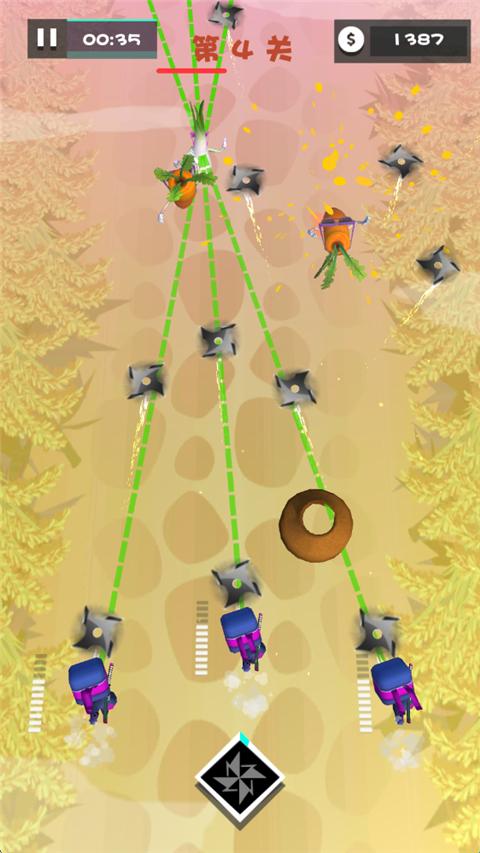 美食大作战是一款以跑酷为玩法的休闲闯关游戏。在游戏中,玩家操控3名忍者在关卡进行攻击道路的各种水果,只需要点击水果即可发起攻击,蓄力松开后释放忍术,能量满时可释放奥义。每一关拥有一个强大的水果BOSS,成功击败它可以获得大量金币奖励,通过金币可强化3名忍者的基础攻击,还可以升级手里剑、学习多种奥义忍术,帮助你更好的闯关!另外,游戏中攻击水果、蔬菜还有不同的打击动画效果,非常有趣。