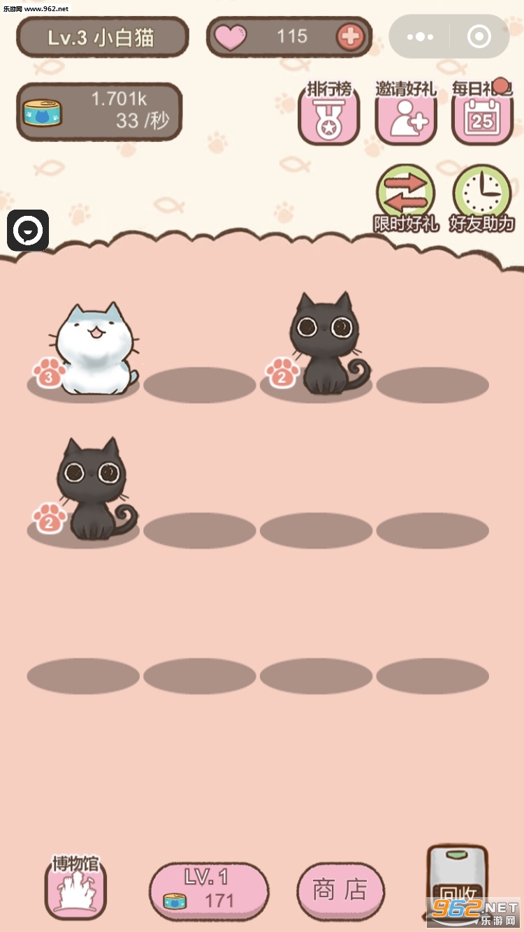 2、将两种一样的猫咪合成更高等级的猫咪;