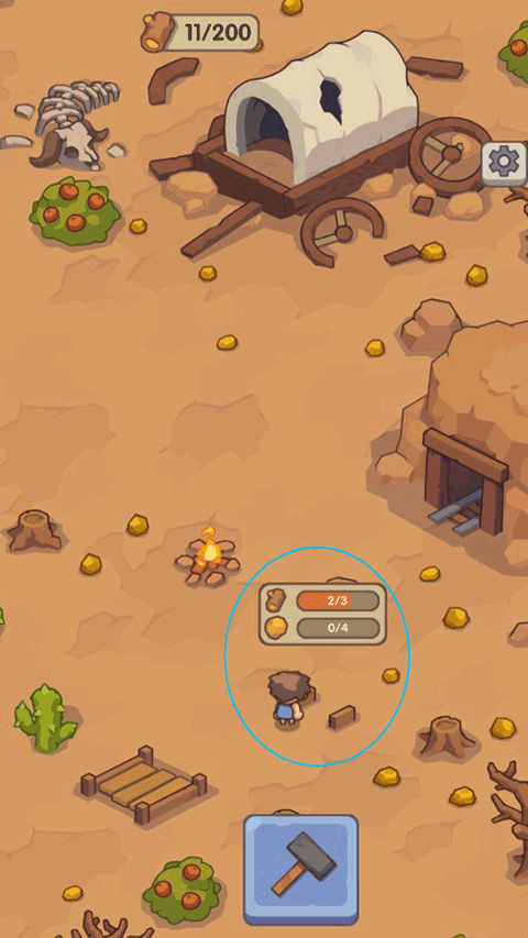 2、进入游戏后我们会有一个小人在屏幕中间我们可以看见一个锤子,这个锤子旁边后续会有其他的功能,我们先点击这个锤子,进入建造中心。