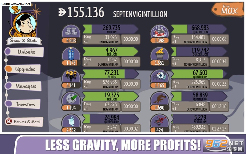 雇佣员工,购买科技升级,征服市场,吸引天使投资人来增加你的收益!
