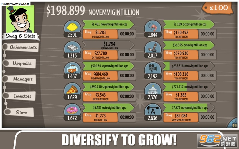 从一开始的柠檬到报纸,披萨,甜甜圈,还有经营球队,银行,石油等等,赚钱速度会越来越快,但你需要操作的东西会越来越少,十分符合经济逻辑——高层不需要再做体力活。