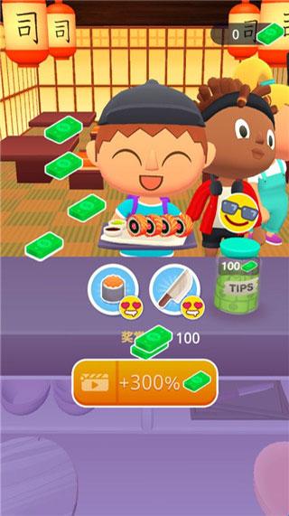 4、制作完成送上美味寿司可获得奖励,点击笑脸表情包还可获得额外奖励;