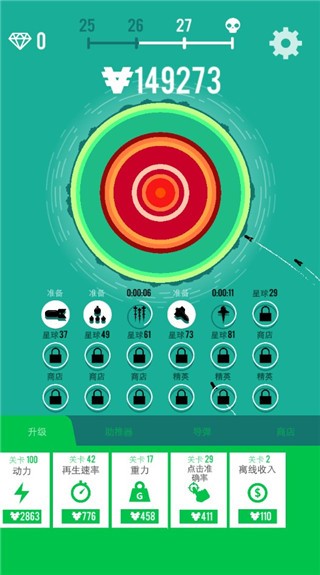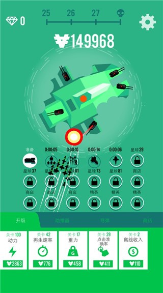 3、摧毁星球后我们可以获得金钱,我们可以点击进行升级轰炸的动力、再生速率、重力、点击准确率等等